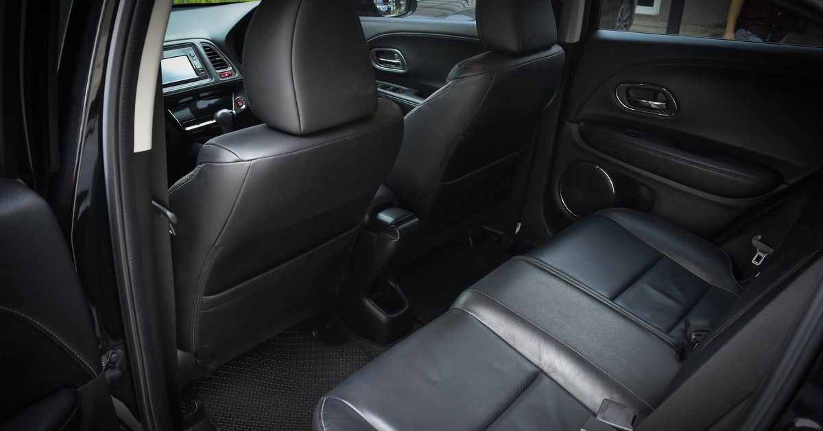 The interior of a modern car from the backseat of the vehicle. The seats are all black leather with no additional color.