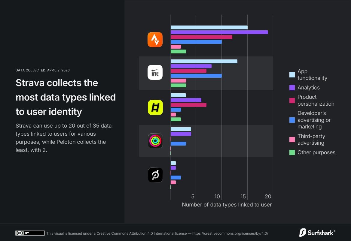 Strava is reported to collect 20 types of data linked to user identity out of 35 categories listed in the Apple App Store, including location data, search history, photos, videos, and user content. Nike Training Club collects 19 data types, while Peloton collects two.